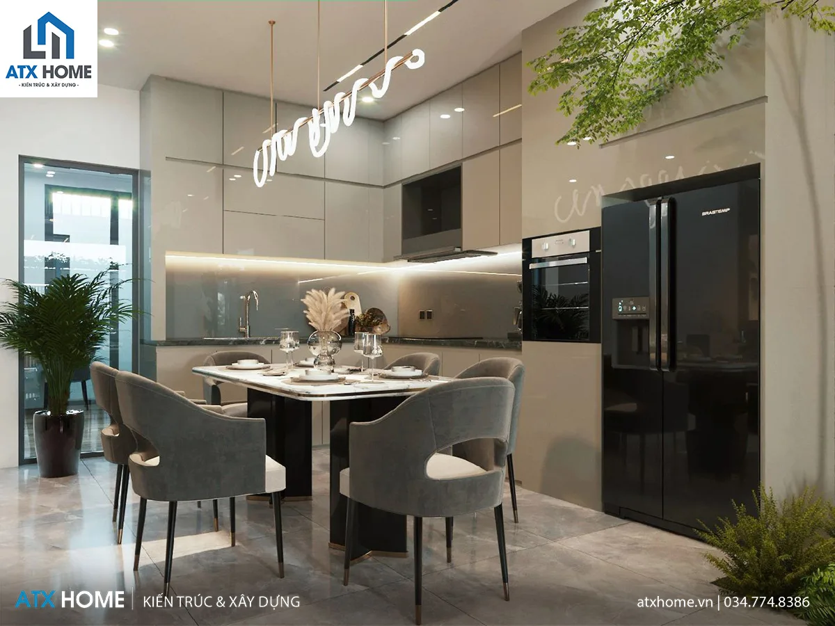 Mẫu nội thất này được thiết kế theo phong cách hiện đại, tập trung vào công năng sử dụng và sự gọn gàng trong sinh hoạt hằng ngày. Không gian được tổ chức rõ ràng giữa phòng khách, bếp và khu ăn uống, sử dụng tông màu trung tính kết hợp vật liệu đá, gỗ và ánh sáng gián tiếp để tạo cảm giác sạch sẽ, dễ chịu. Nội thất bố trí vừa đủ, ưu tiên lối đi thoáng, thuận tiện cho gia đình sử dụng lâu dài mà không bị rối hay lỗi thời.