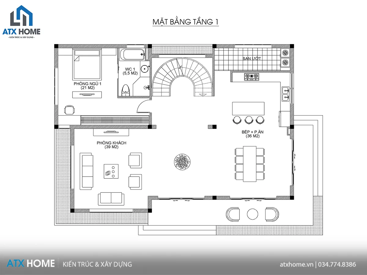 Tầng 1: Gồm phòng khách 39m², bếp + phòng ăn 36m², 1 phòng ngủ rộng 21m² và WC chung 5,5m². Các không gian được liên kết mở, tạo cảm giác rộng thoáng và tiện nghi cho sinh hoạt chung.