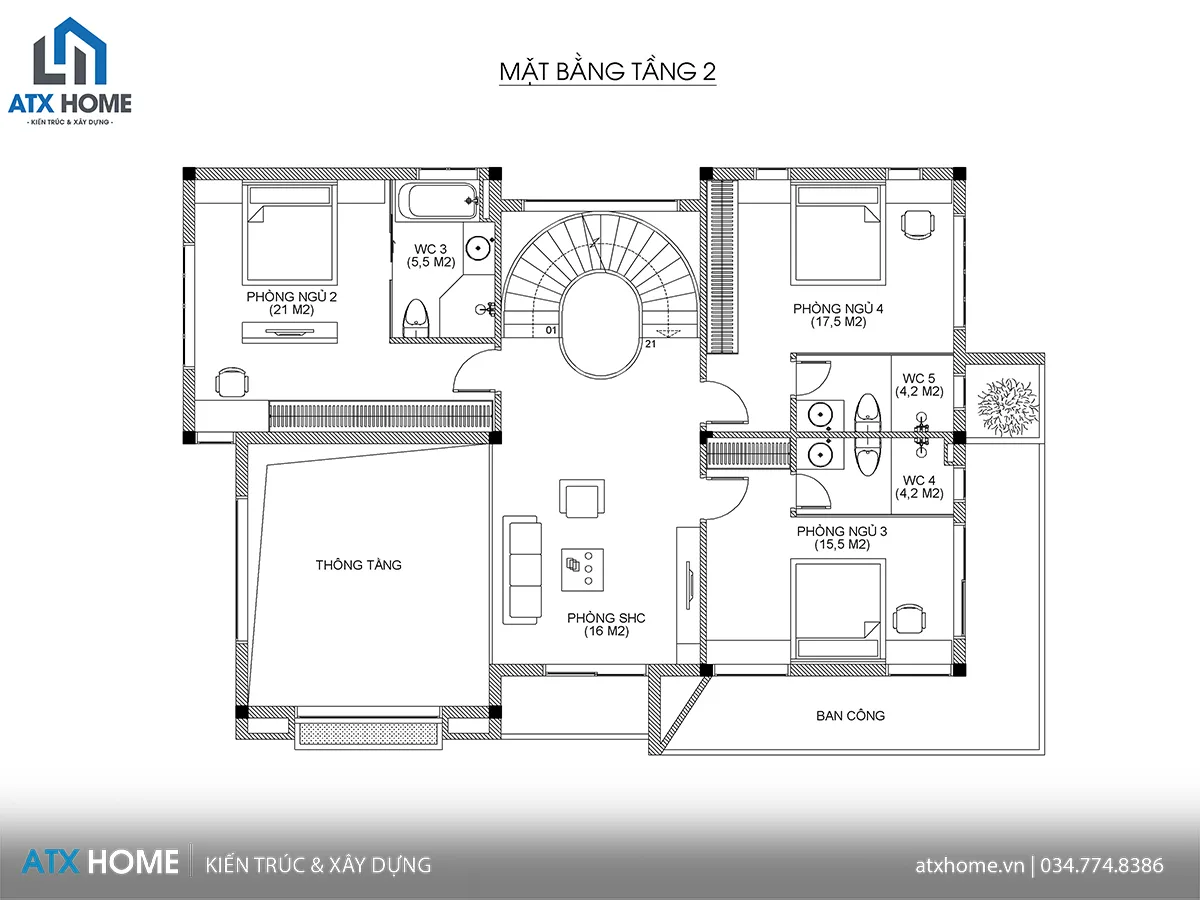 Tầng 2: Bố trí 3 phòng ngủ (từ 15,5 đến 21m²), phòng sinh hoạt chung 16m², 3 WC tiện nghi và ban công hướng sáng. Khu vực thông tầng giúp lấy sáng tự nhiên, điều hòa không khí cho toàn bộ tầng trên.