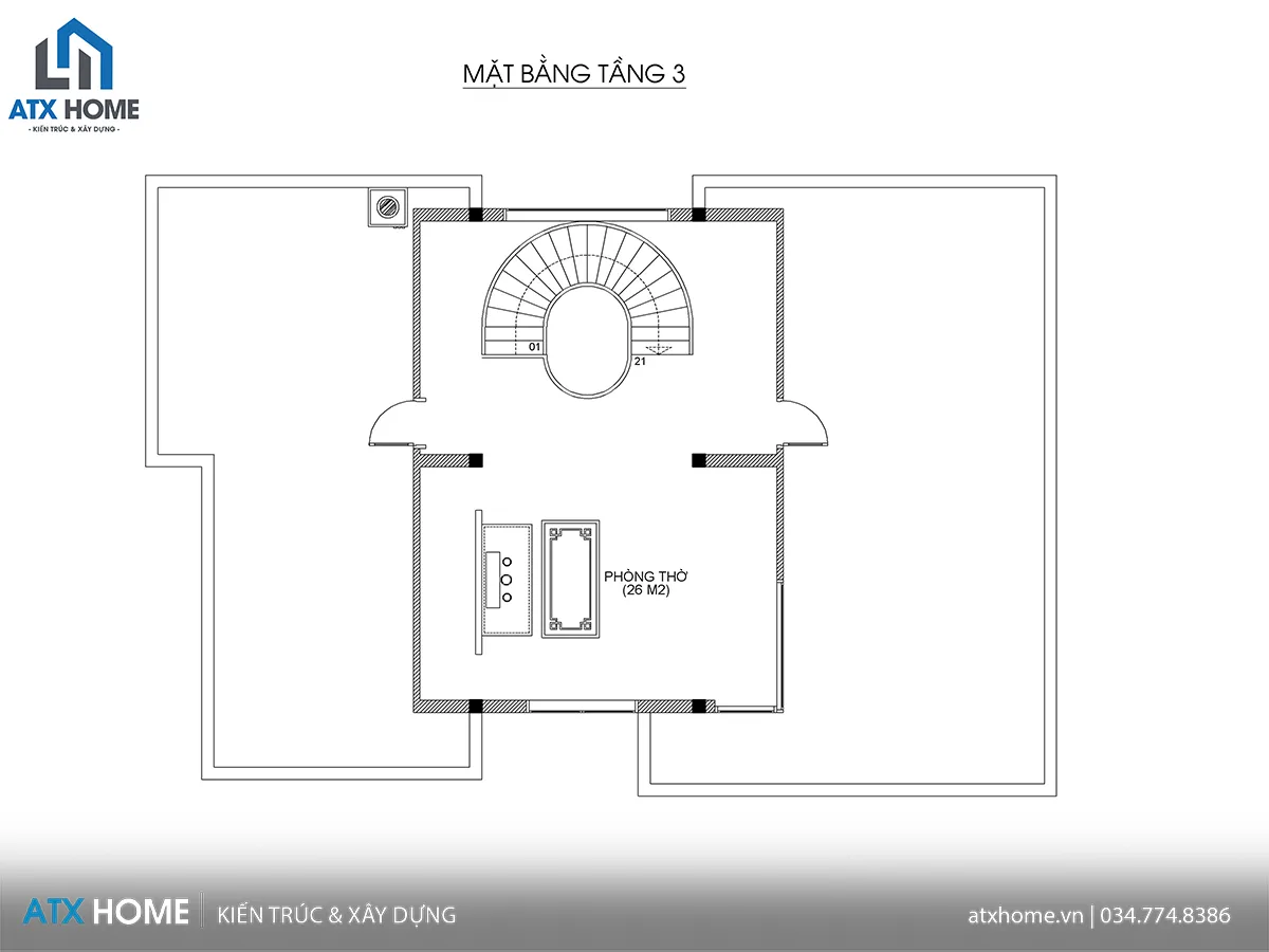 Tầng 3: Phòng thờ diện tích 26m² trang trọng, yên tĩnh, kết nối với khoảng sân thoáng – không gian lý tưởng để thư giãn, trồng cây xanh hoặc tổ chức các buổi sum họp gia đình.